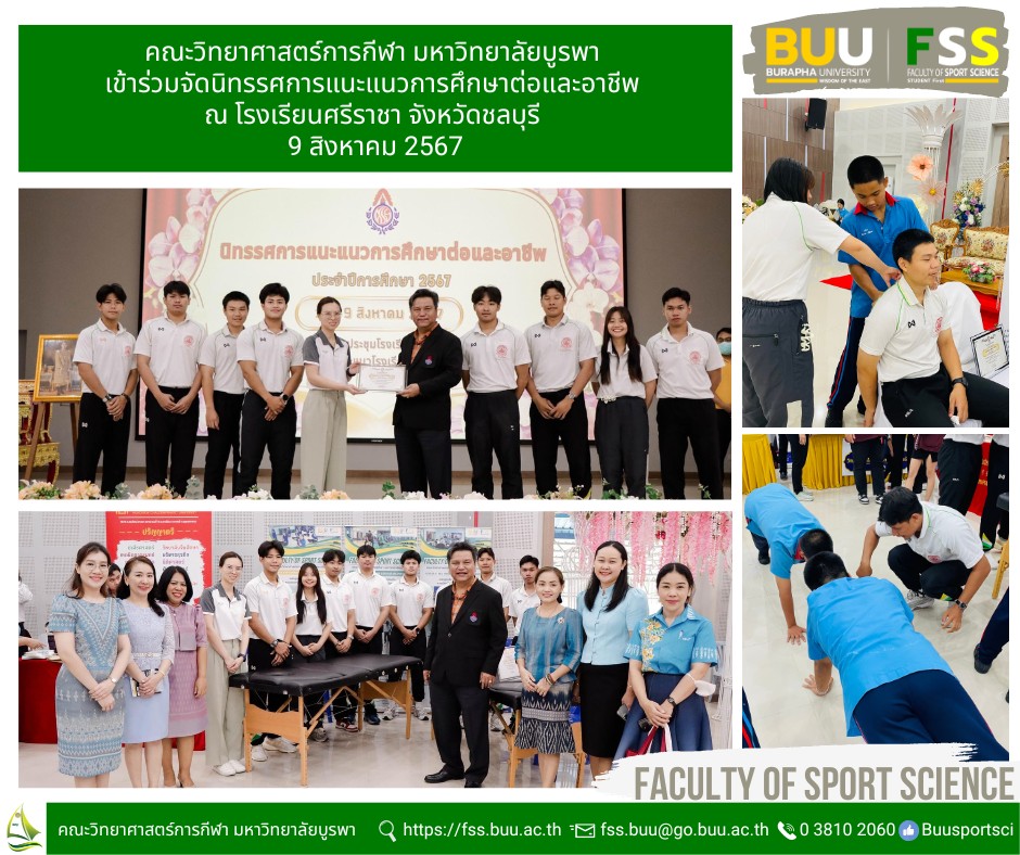 หน้าหลัก กิจกรรม รายละเอียด 2024-8-9 กิจกรรมแนะแนวการศึกษาต่อและอาชีพ ณ โรงเรียนศรีราชา จังหวัดชลบุรี คณะวิทยาศาสตร์การกีฬา มหาวิทยาลัยบูรพา เข้าร่วมจัดนิทรรศการแนะแนวการศึกษาต่อและอาชีพ ณ โรงเรียนศรีราชา จังหวัดชลบุรี เมื่อวันที่ 9 สิงหาคม 2567 เพื่อประชาสัมพันธ์และให้ข้อมูลและแนะแนวการศึกษาต่อให้แก่นักเรียนที่สนใจ